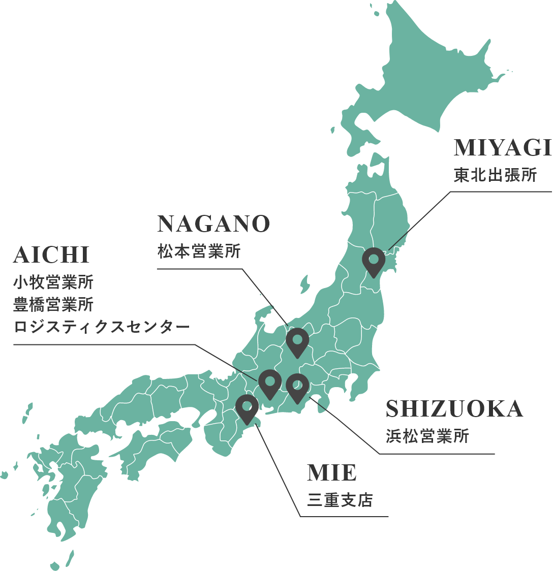 三重支店、小牧営業所、豊橋営業所、浜松営業所、松本営業所、ロジスティクスセンター、あかりえ菜園、東北出張所